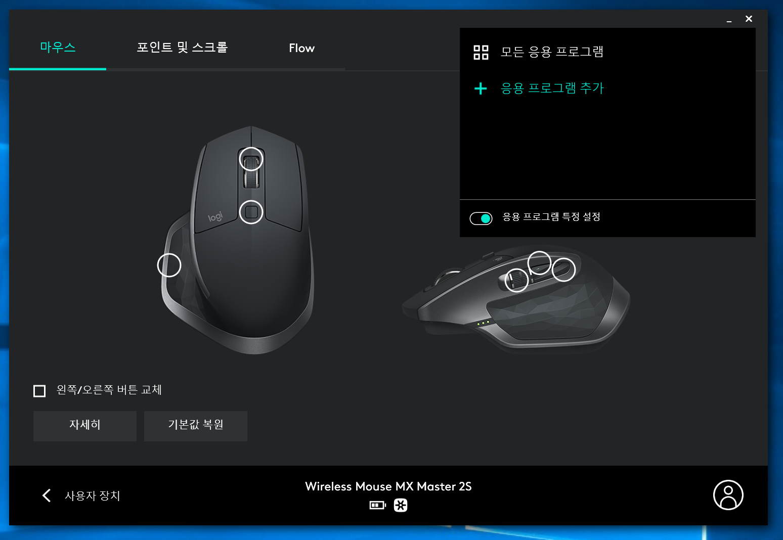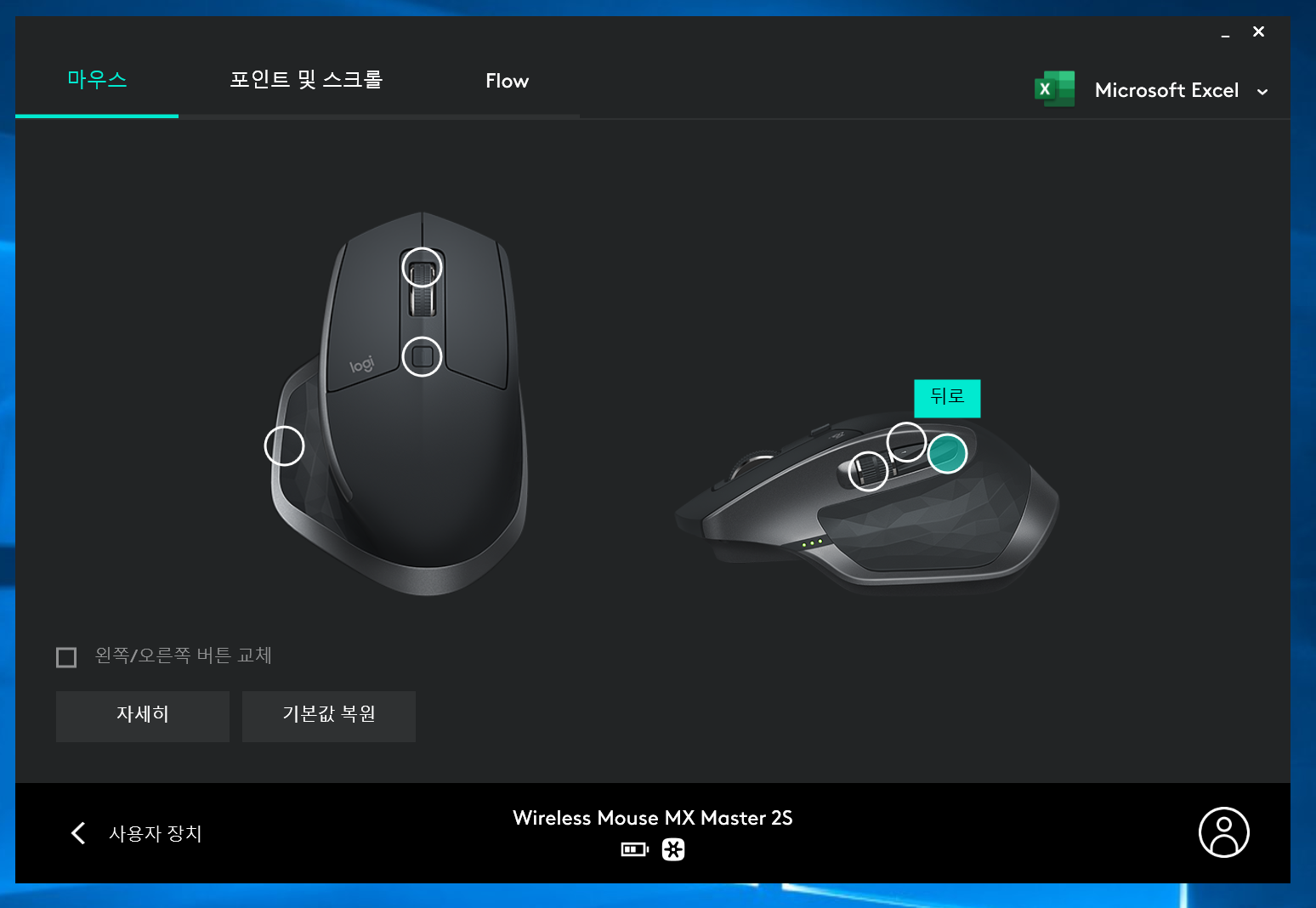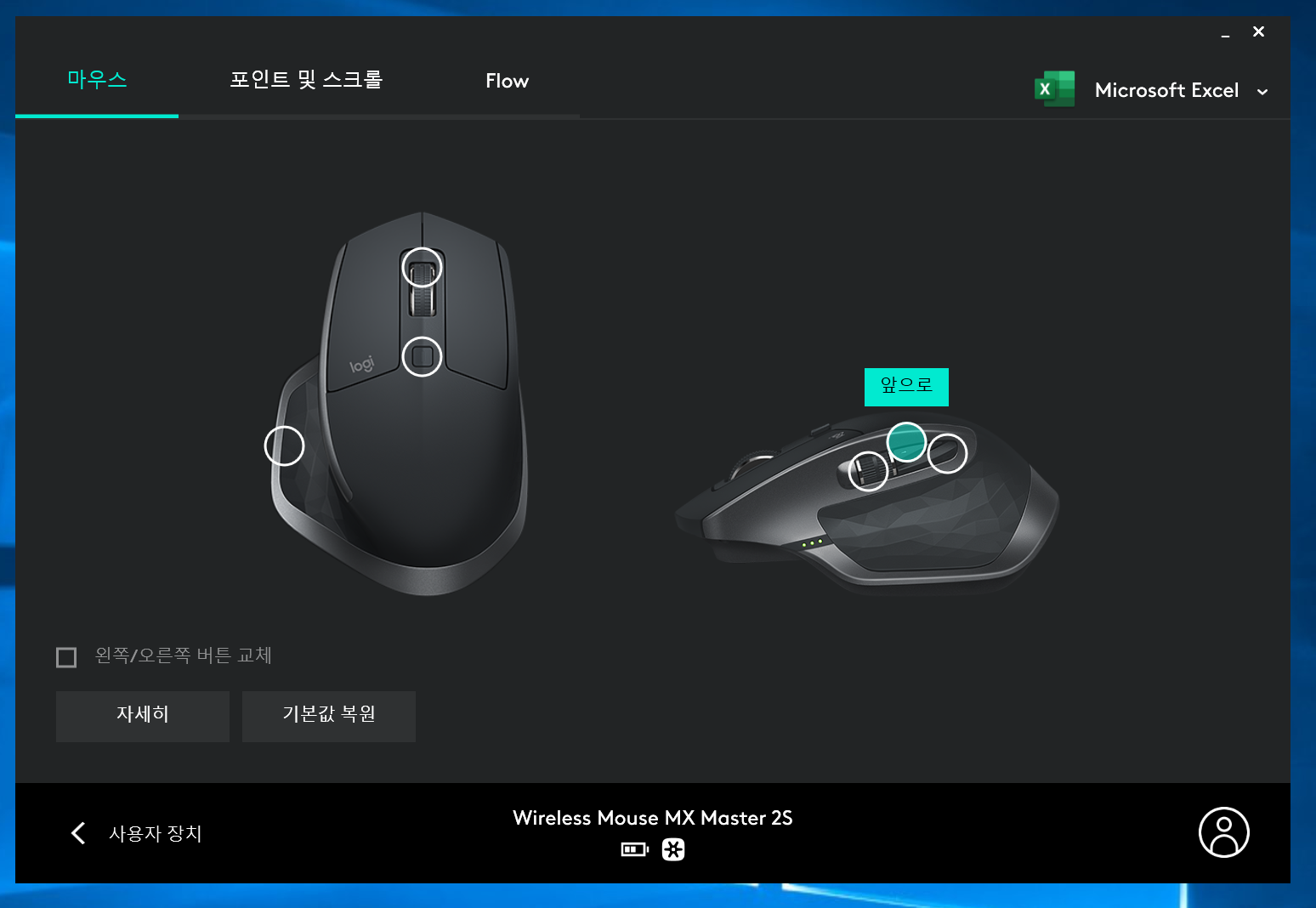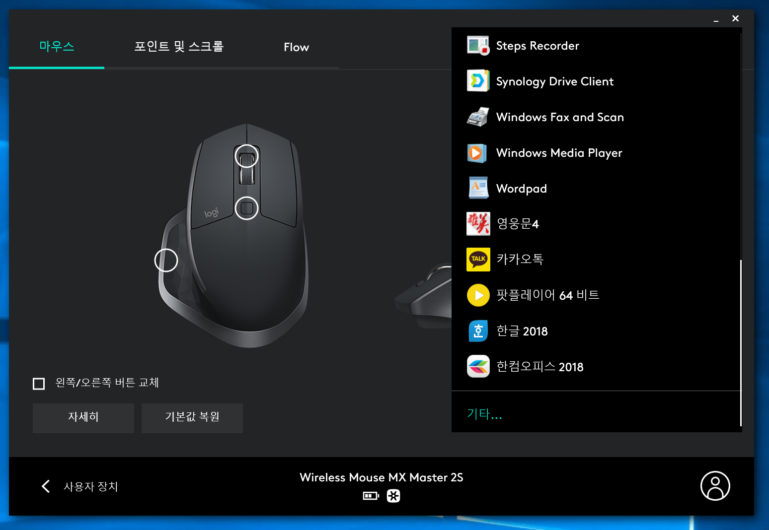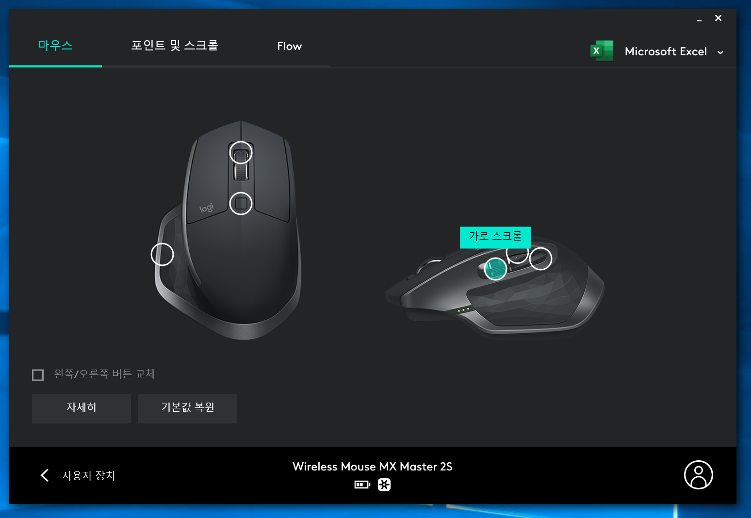 추가로 응용프로그램마다 버튼의 기능을 다르게 설정할 수 있다. 그래서 나는 엑셀을 쓸 때는 썸휠로 가로/세로 스크롤이 되게 설정을 해 놓았다.