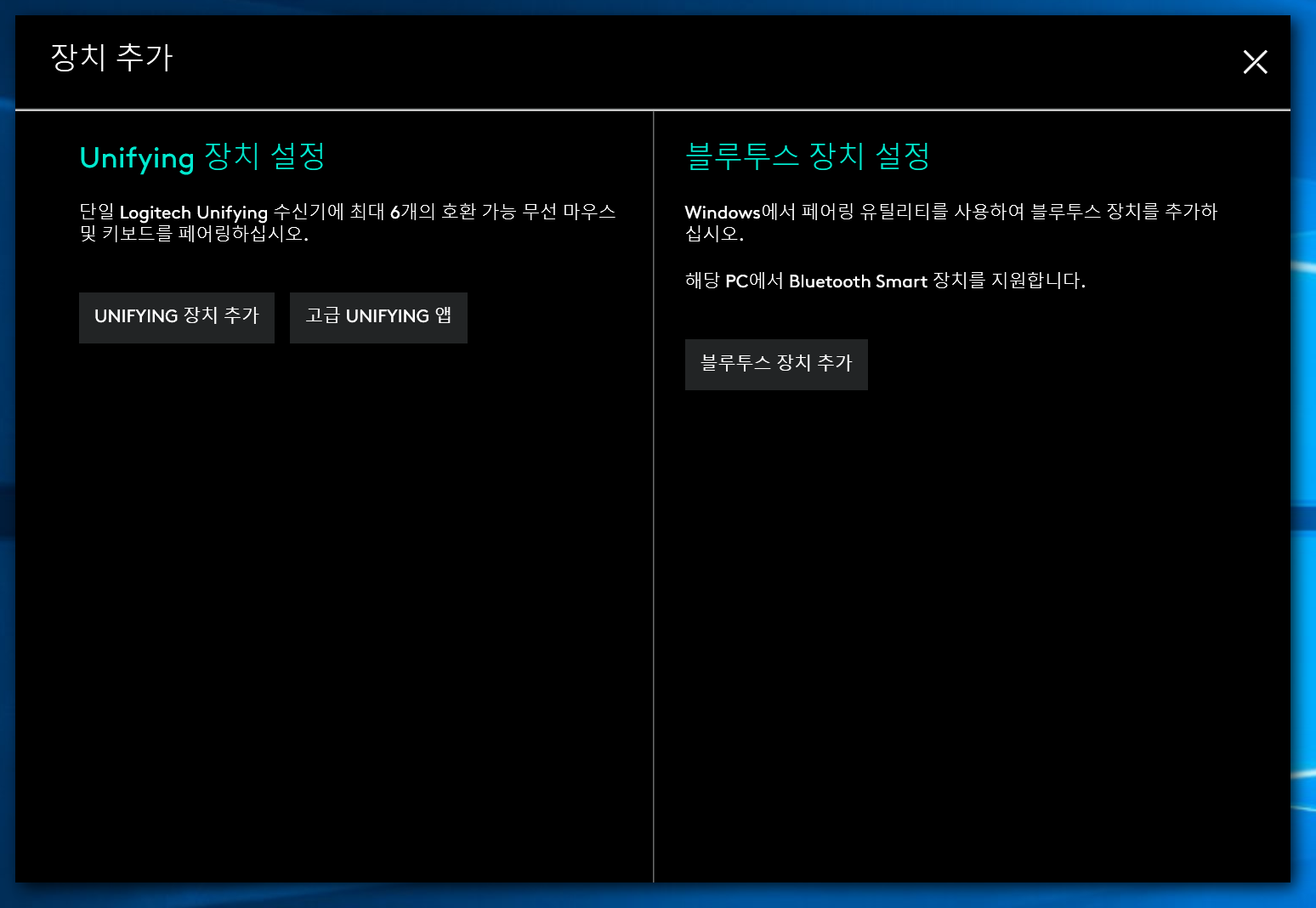 Unifying 장치가 있다면 왼쪽의 'Unifying 장치 추가'를 클릭하고, 컴퓨터의 기본 블루투스 기능을 사용하고자 한다면 오른쪽의 '블루투스 장치 추가' 버튼을 누르면 된다.