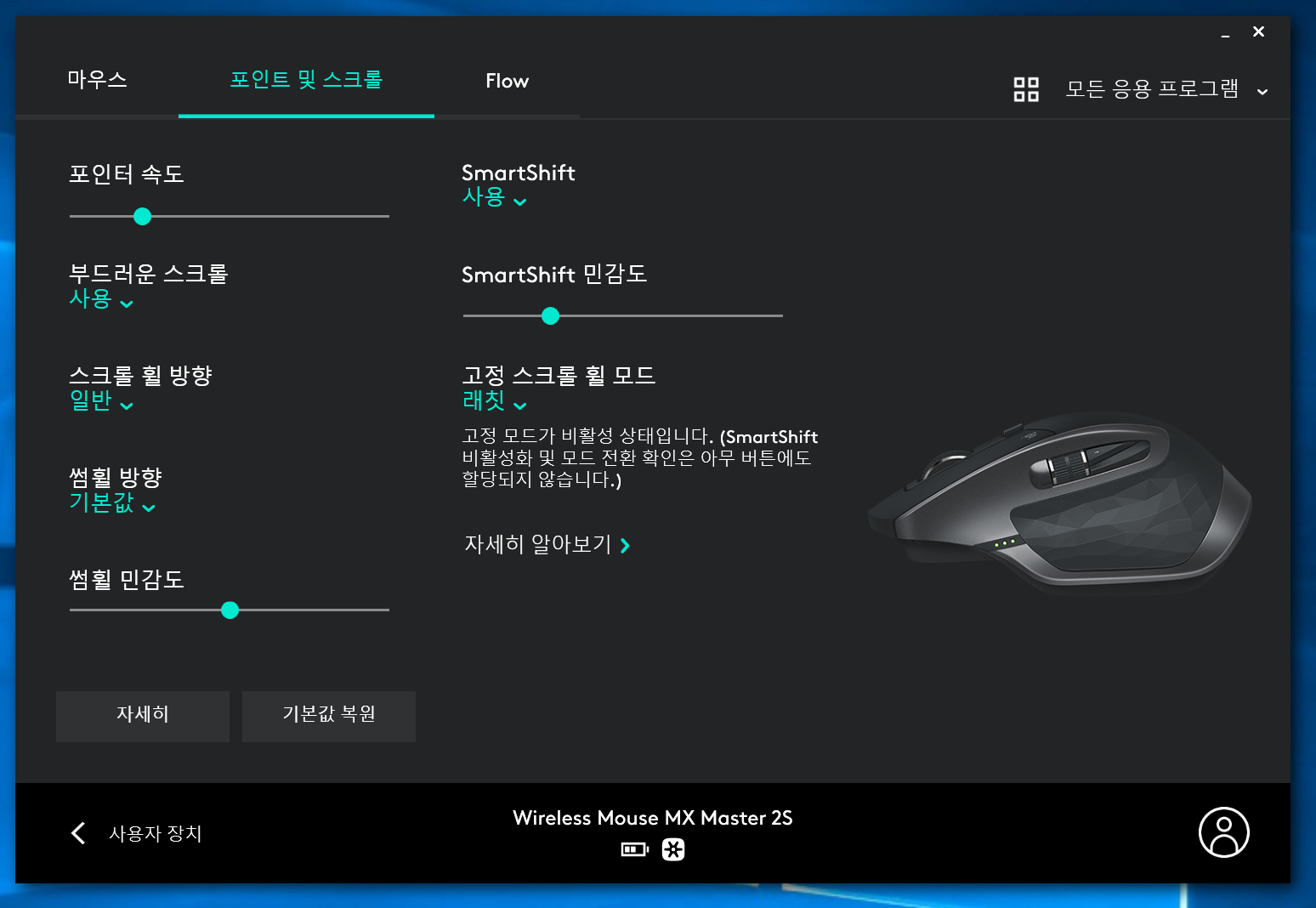 그러나 MX Master 시리즈는 SmartShift라는 기능이 있다.(위 사진의 가운데 위쪽)