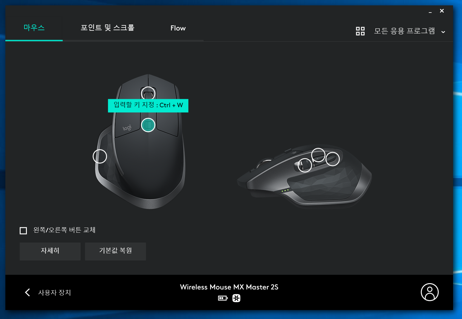 휠을 세게 돌리면 무한휠 모드가 알아서 전환되고, 휠을 느리게 돌리면 한 칸씩 걸리면서 돌아간다. 이 때문에 휠 모드 전환 기능은 필요가 없을 것 같아 내가 제일 자주 쓰는 기능이 무엇일까 생각하다가 Ctrl+W로 설정을 하게 되었다.