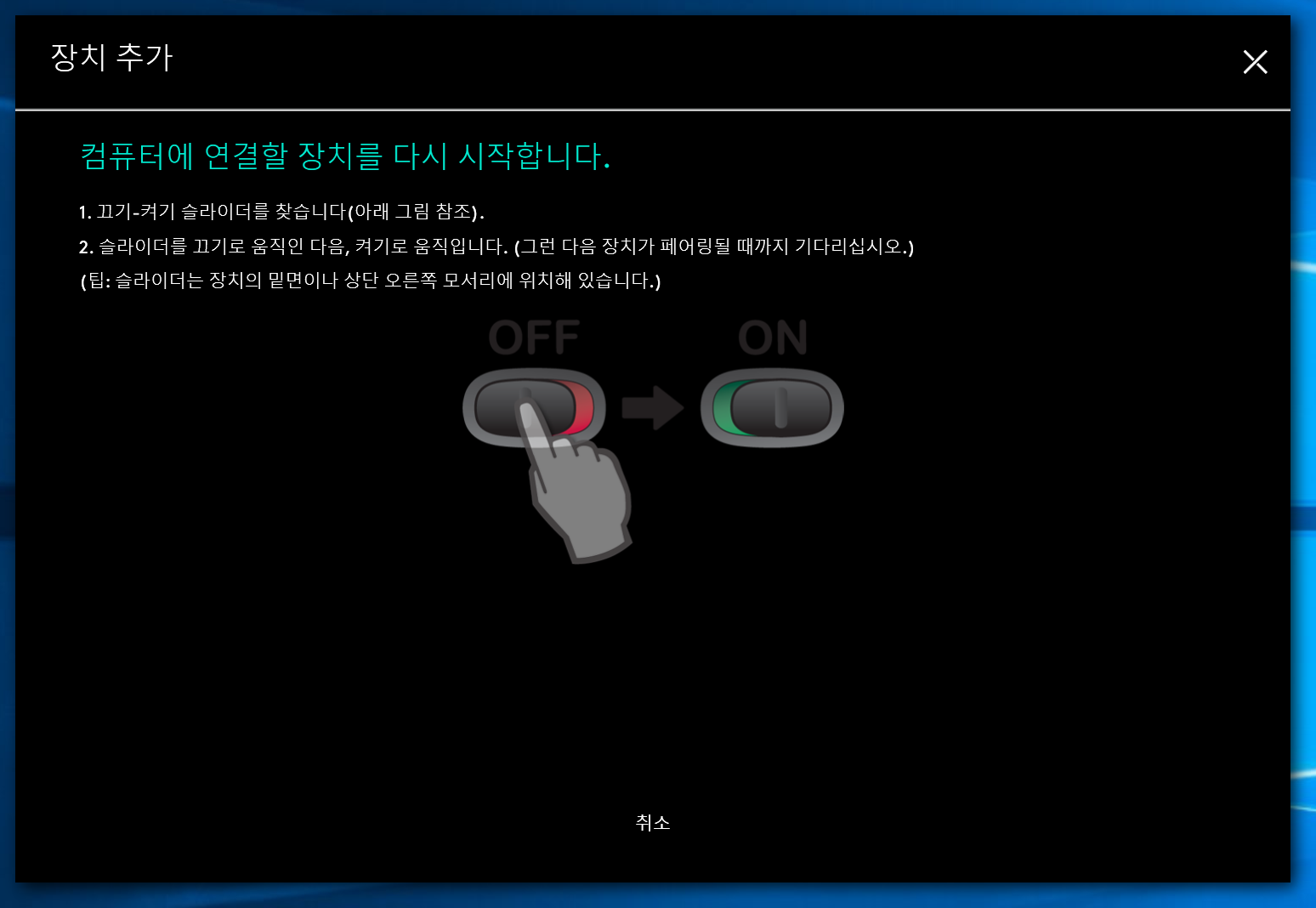 Unifying 수신기를 먼저 컴퓨터 USB 포트에 꽂은 뒤 위의 'Unifying 장치 추가'버튼을 눌러야 한다.