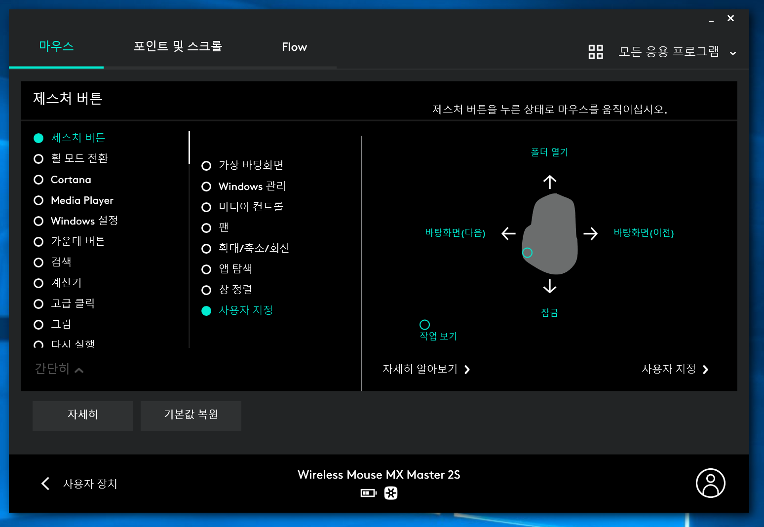 필자는 제스처 버튼을 위와 같이 설정했다. 제스처 버튼은 총 5가지 경우로 활성화시킬 수 있다. 제스처 버튼을 누르기, 누르고 마우스를 위로 이동, 누르고 마우스를 아래로 이동, 누르고 마우스를 왼쪽으로 이동, 누르고 마우스를 오른쪽으로 이동 다섯 가지이다.
