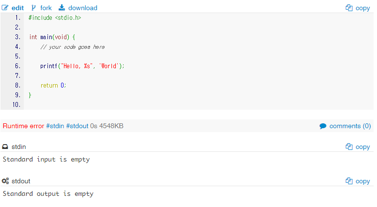 그림 4는 C언어를 선택한 화면이다. 기본적인 코드가 작성되어 있다. 코드를 추가로 작성해 테스트해볼 수 있다.