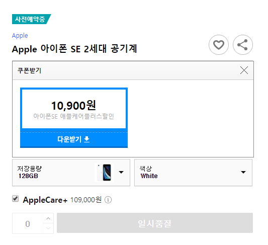 오늘 아이폰 SE 사전예약 주문을 하는지도 모르고 있었다. 지인이 아이폰 SE 주문에 성공했다고 해 오전 10시경부터 쿠팡 아이폰 판매 페이지에서 새로고침을 하기 시작했다. 처음에는 레드를 사려고 했으나, 블랙 색상이 더 무난할것 같아 블랙을 최종적으로 주문하게 됐다.