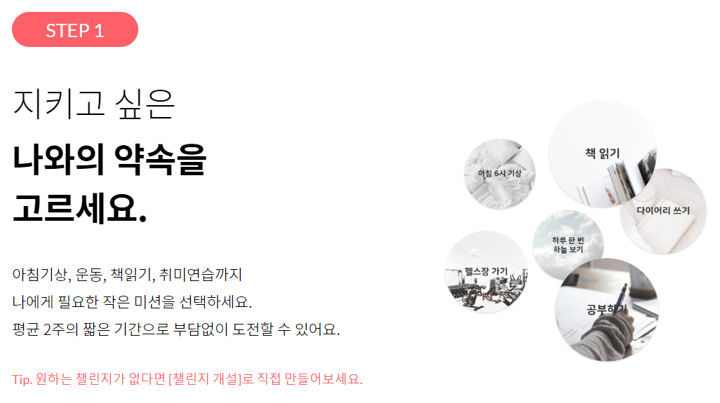 항상 계획을 세우고 몇 일 못가 흐지부지 되는 경우가 너무 많다. 챌린저스에서는 여러 가지 미션이 최소 2주 단위로 진행된다. 짧은 미션을 여러 번 성공하면 자신감도 생기고 바람직한 습관을 들이기에도 좋다.