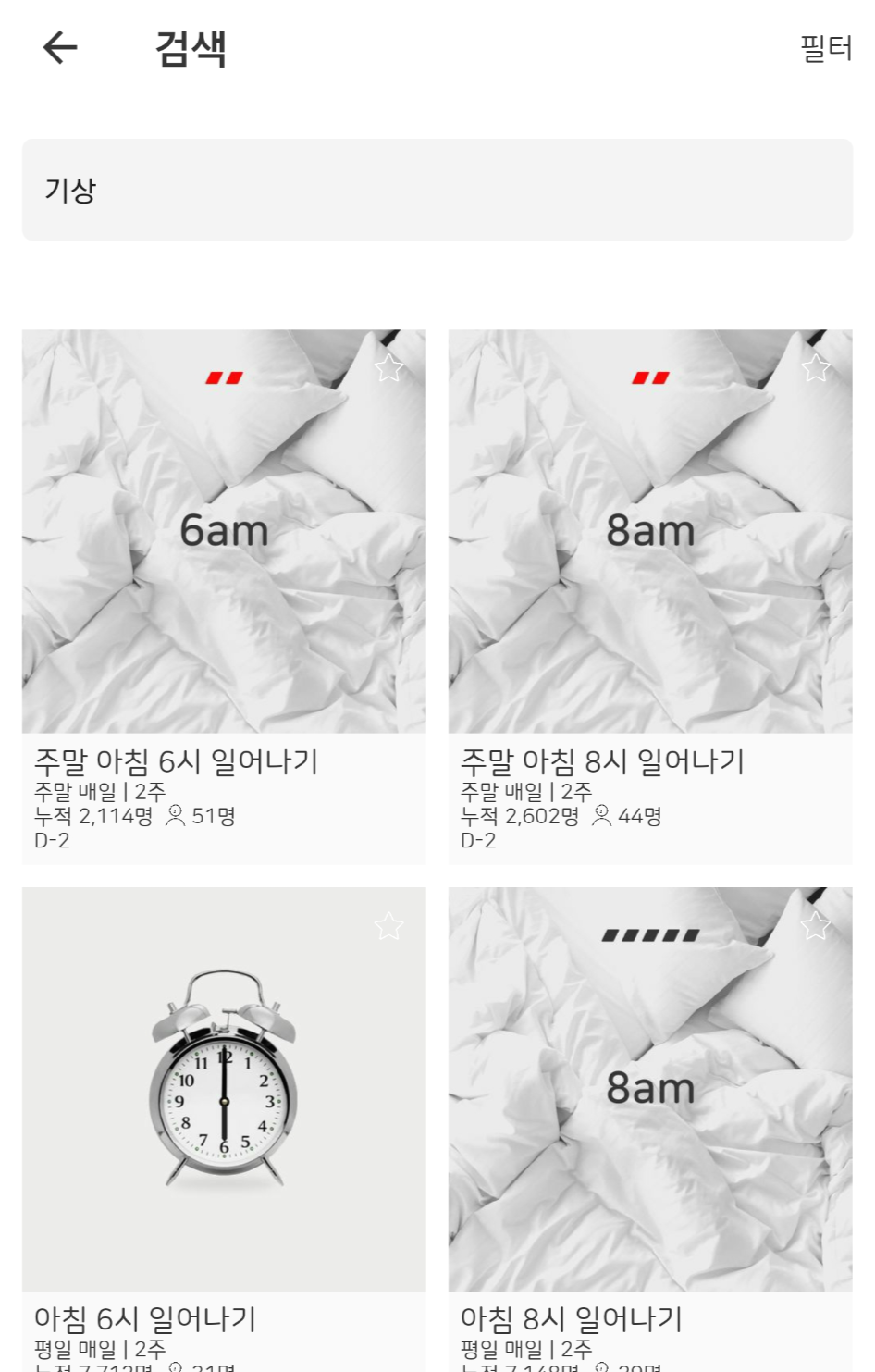 기상 미션을 검색하면 여러 가지 미션이 나온다. 그러나 6시 기상, 7시 기상, 8시 기상을 한 번에 신청할 수 없다. 필자는 보통 4~5시에 일어나는데 깜빡하고 인증을 하지 못할까봐 6시 기상 미션에 만원을 걸어서 잘 할수 있는지 실험중이다. 미션 인증을 해야 하는 또다른 습관이 필요하다.