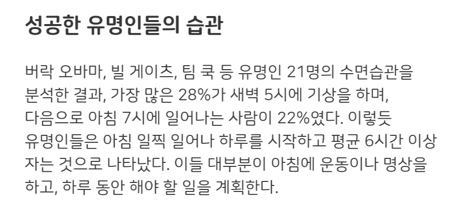 아침에 일찍 일어나려면 자는 시간을 줄이는 것보다 일찍 자는 것이 효과적이다. 잠자는 시간을 줄이면 다음날 더 피곤해질 뿐이다. 필자는 10시 30분에 규칙적으로 자려고 노력한다. 잠자리에 누워서는 휴대폰을 절대 보지 않는다. 휴대폰을 보는 습관만 끊어내도 아침에 일찍 일어날 수 있다.
