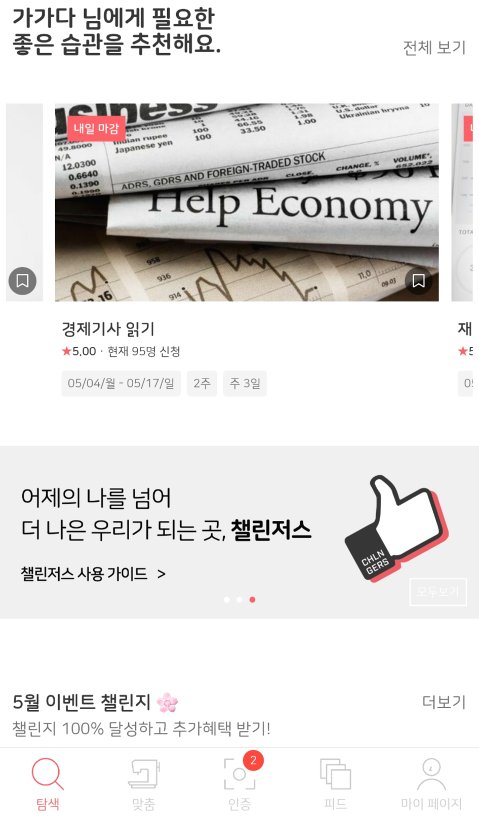 챌린저스 앱을 실행하면 가장 먼저 나타나는 페이지이다. 맨 위의 추천 미션부터 둘러본다.