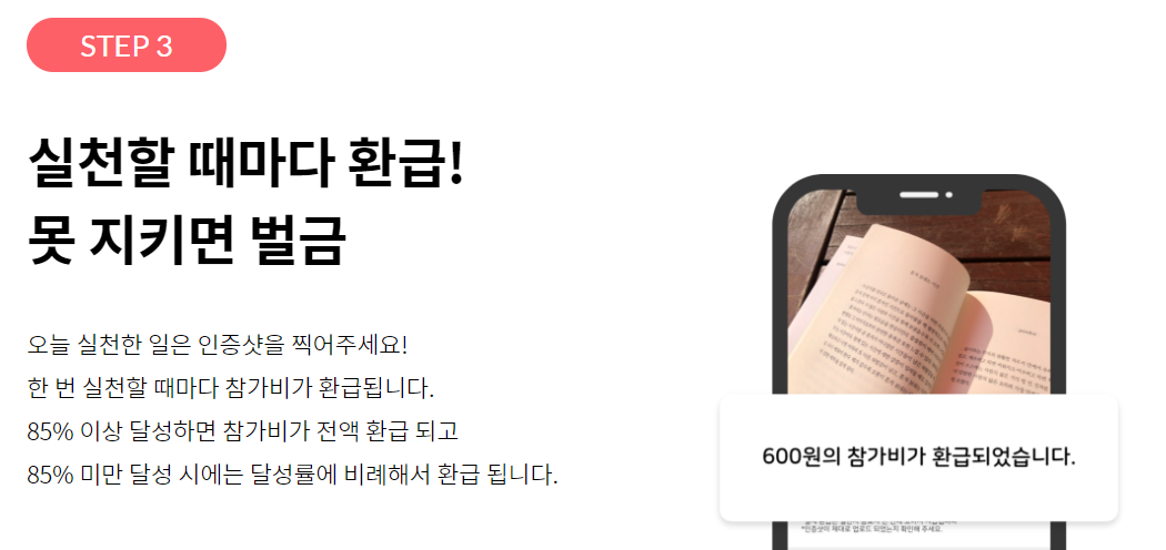 미션 성공률에 따라 참가비 환급, 상금이 제공된다. 자신에게 도움되는 미션을 찾고 성공해 나가면서 성취감도 얻고 돈도 벌면 행복한 일상이 지속되지 않을까 생각한다.